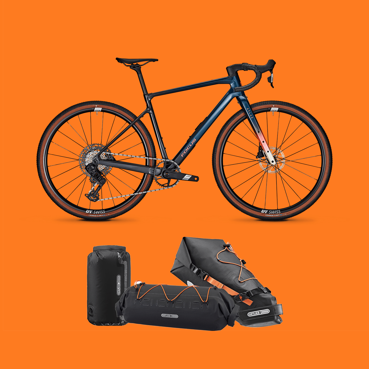 Win a FOCUS ATLAS 8.8 gravel bike, perfectly equipped for your next adventure with high-quality bike packing bags from Ortlieb and a tubeless ready set from Schwalbe. Ready for unlimited gravel fun until sunset and beyond!